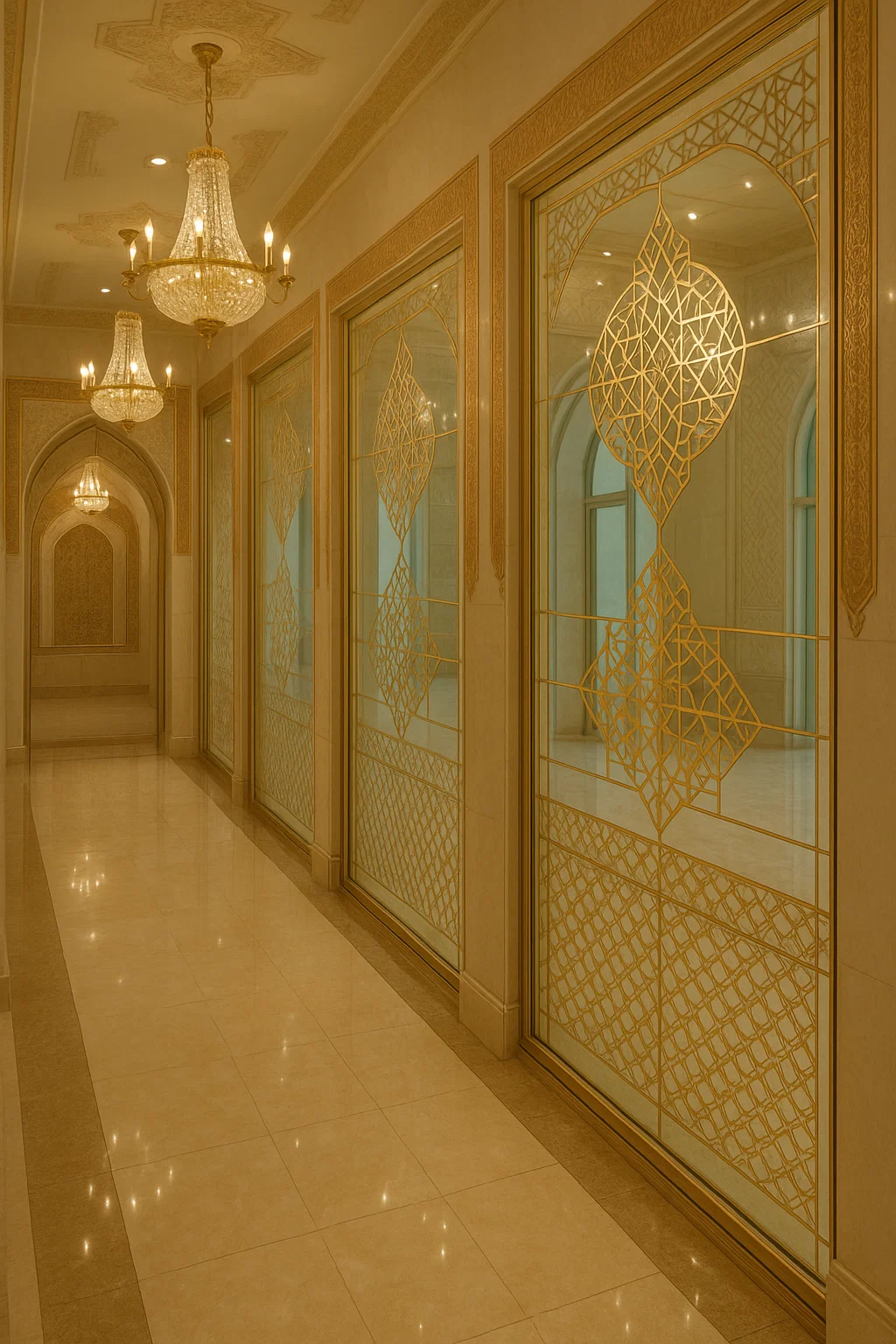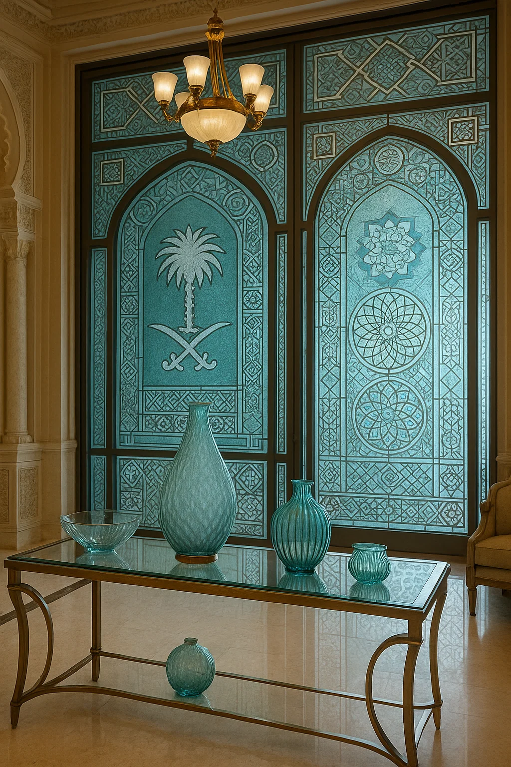- التصاميم الزجاجية الفنية: مثل الزجاج المزخرف والملون والمصنفر والمطبوع بتقنيات حديثة.