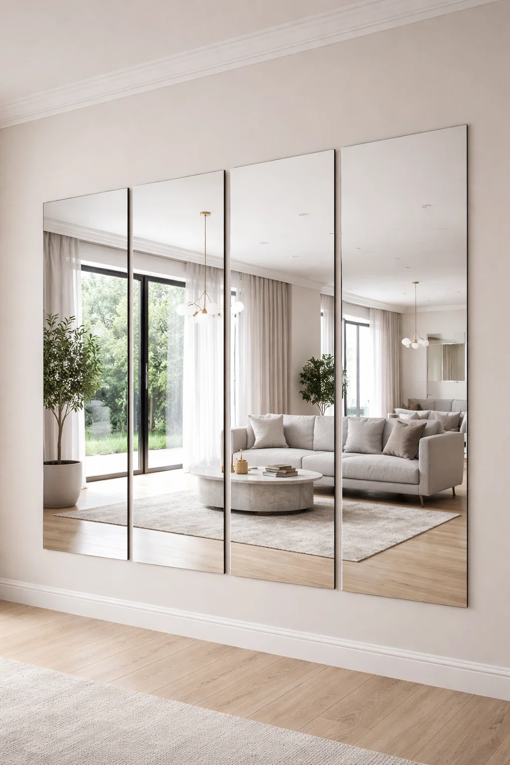 - المرايا الكبيرة الجدارية (wall-to-wall): والتي تغطي الجدار باكمله مثالية للصالات الكبيرة او غرف التمارين هذه تتطلب اطارا قويا من الالمنيوم او الاستانلس للدعم وتعمل على تضخيم المساحة بصريا بنسبة تصل الى 70%.