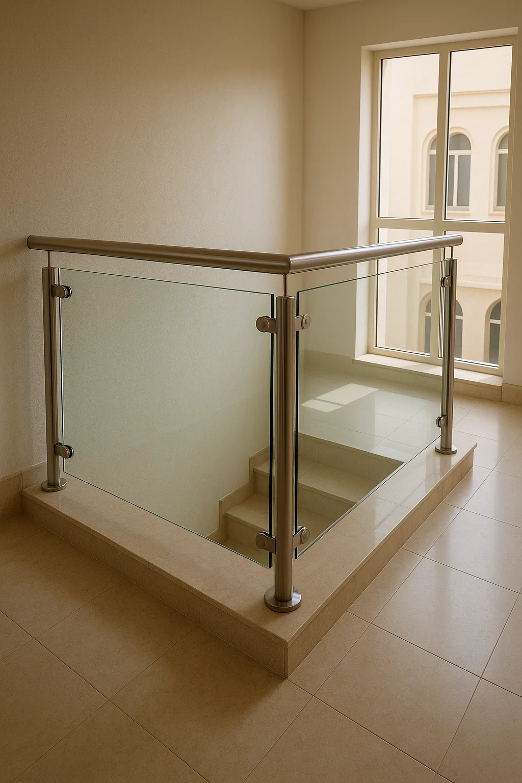 - درابزين زجاج مع قواعد ستانليس ستيل: الاكثر اتشارا لمتانتة وجاذبيتة كما يناسب السلالم والممرات.